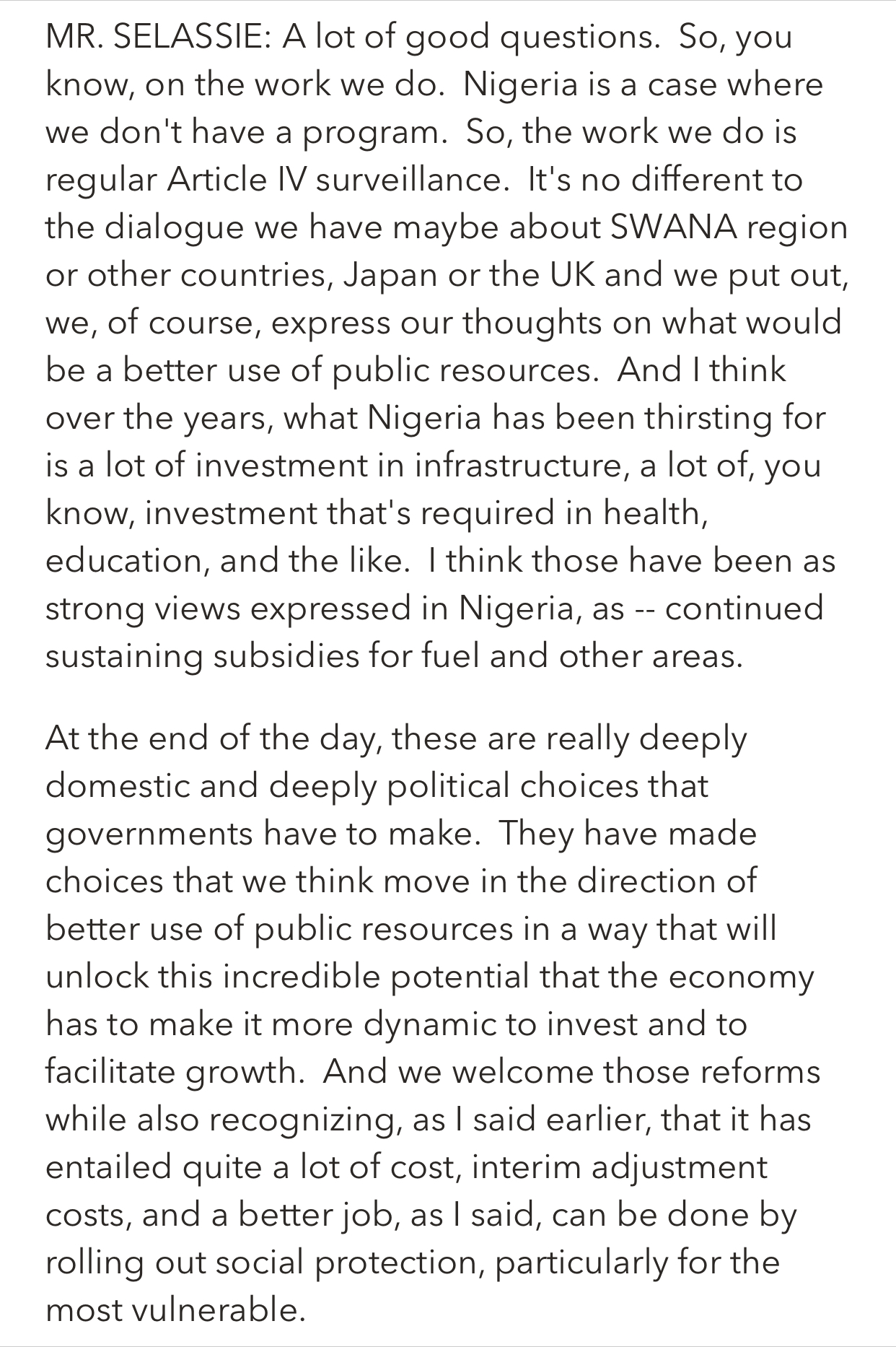 To sai dai baya ga dukkan wadancan shawarwari da asusun na IMF ya dinga baiwa Najeriya kan ta cire tallafin man fetur Sai kuma ranar 25 ga watan Oktoban 2024 aka ji Daraktan IMF mai kula da Afirka Abebe Aemro Sellasie na cewa batun cire tallafin man fetur na Najeriya batu ne na cikin gida kuma na siyar cikin gida wato Najeriya, yace “